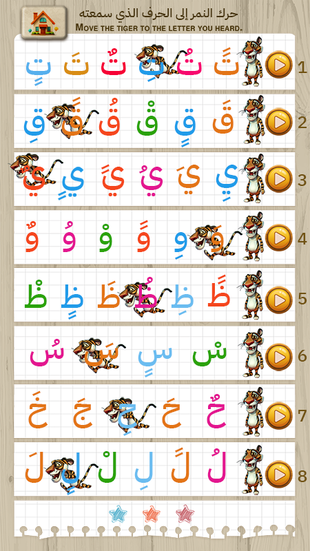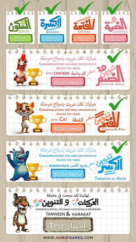 وفي حال نجح اللاعب في جميع المراحل سيأتيه اختبار يسمع الحرف مع حركته ثم يختاره من مجموعة حروف .