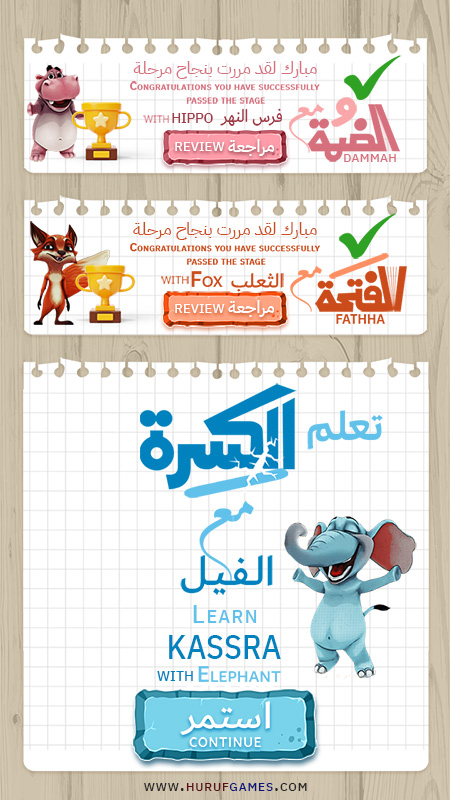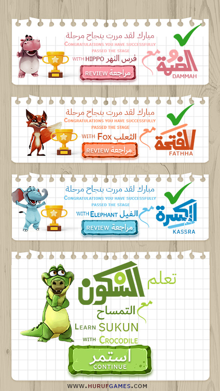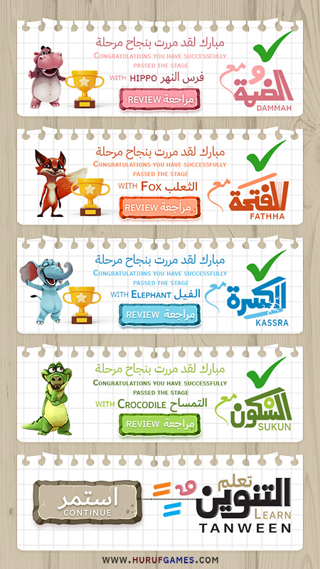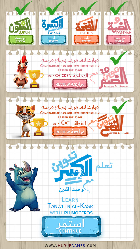اللعبة عبارة عن سبع مراحل ولكل مرحلة حركة وسيعرف كامل الحركات الضمة – الفتحة – الكسرة – السكون ثم تنوين الضم و الفتح و الكسر ولكل مرحلة حيوان.